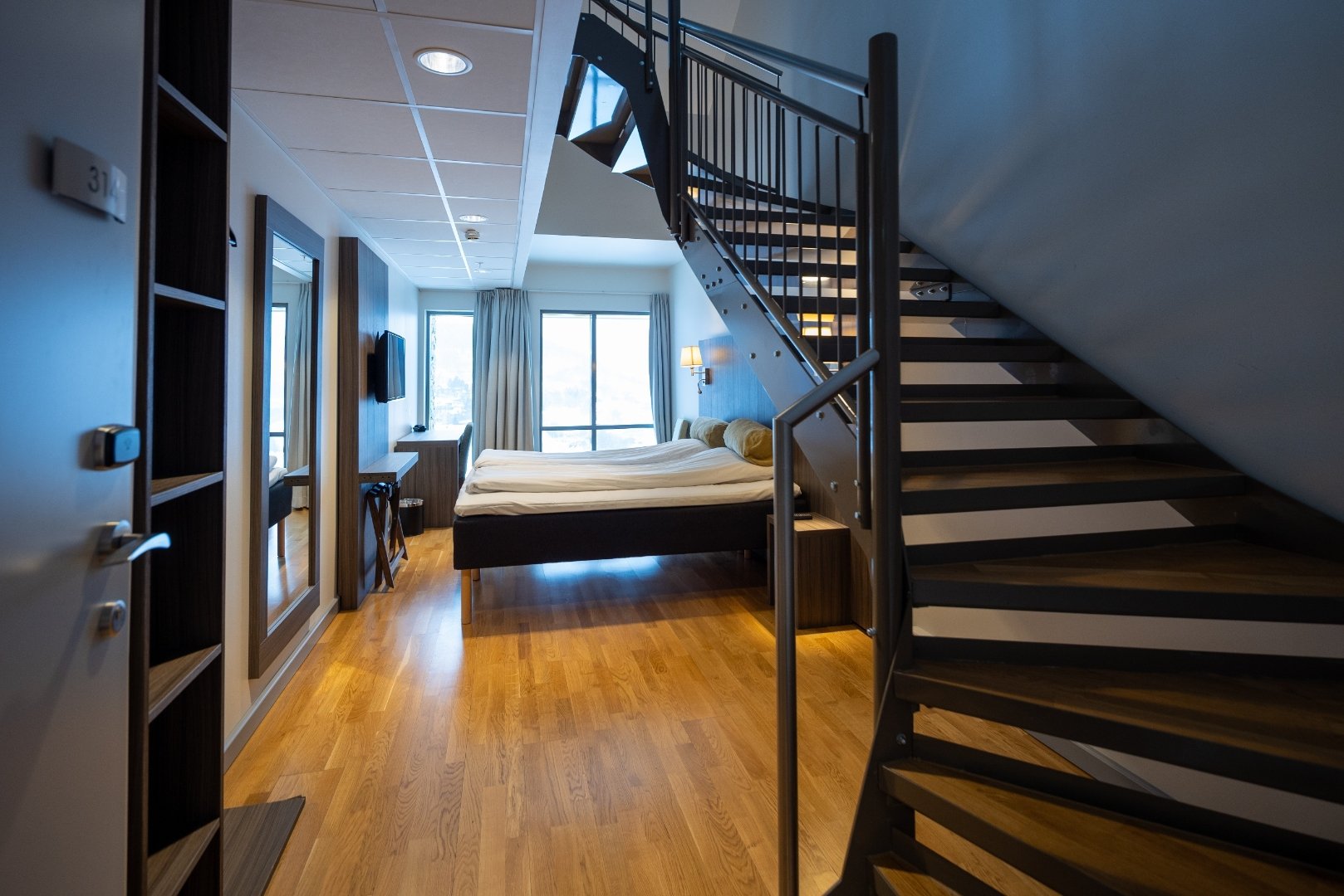 Rommet har dobbeltseng og sitteområde i første etasjen, i andre etasje er det bad og balkong. Rommet kan også brukes til familierom.